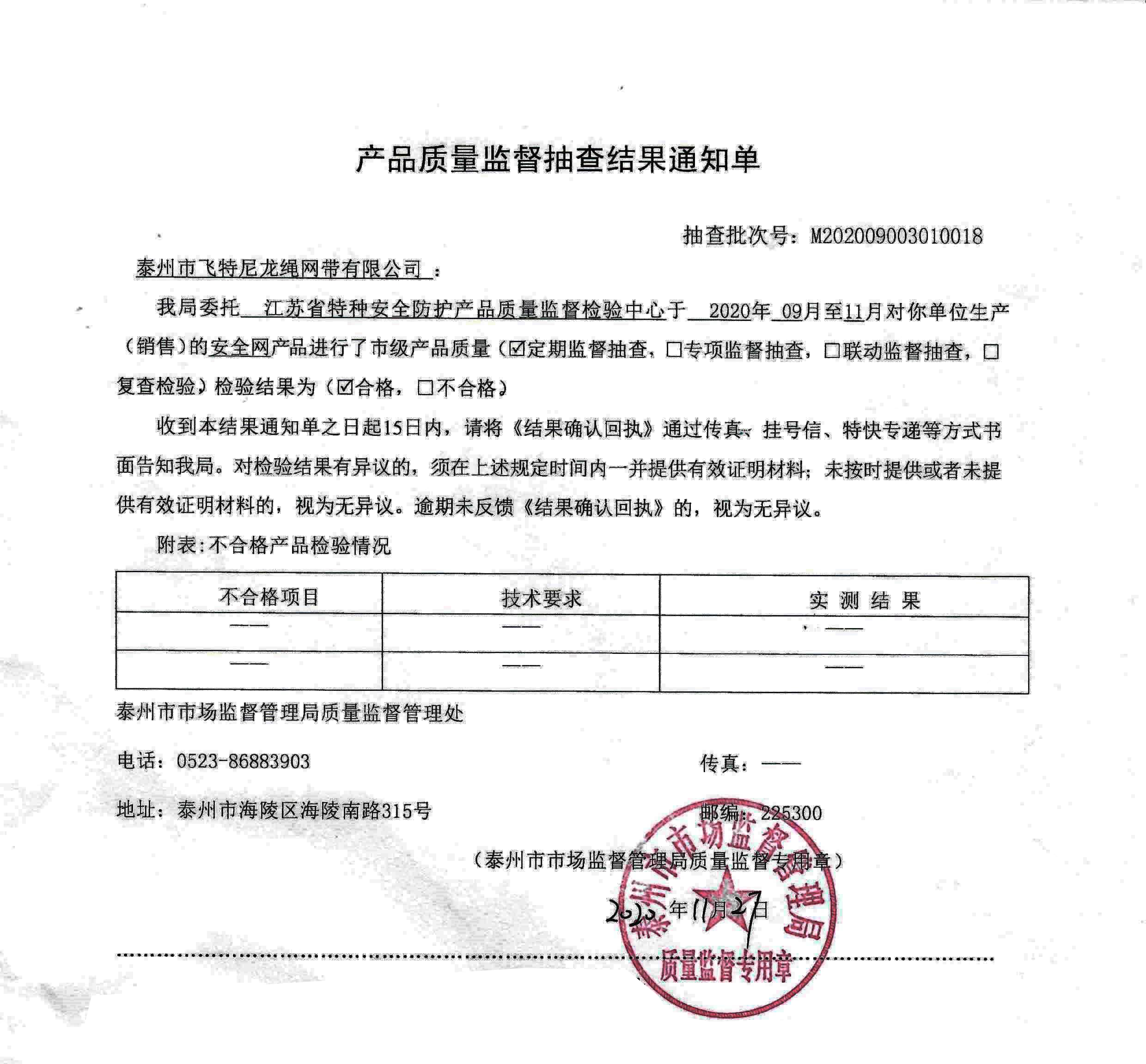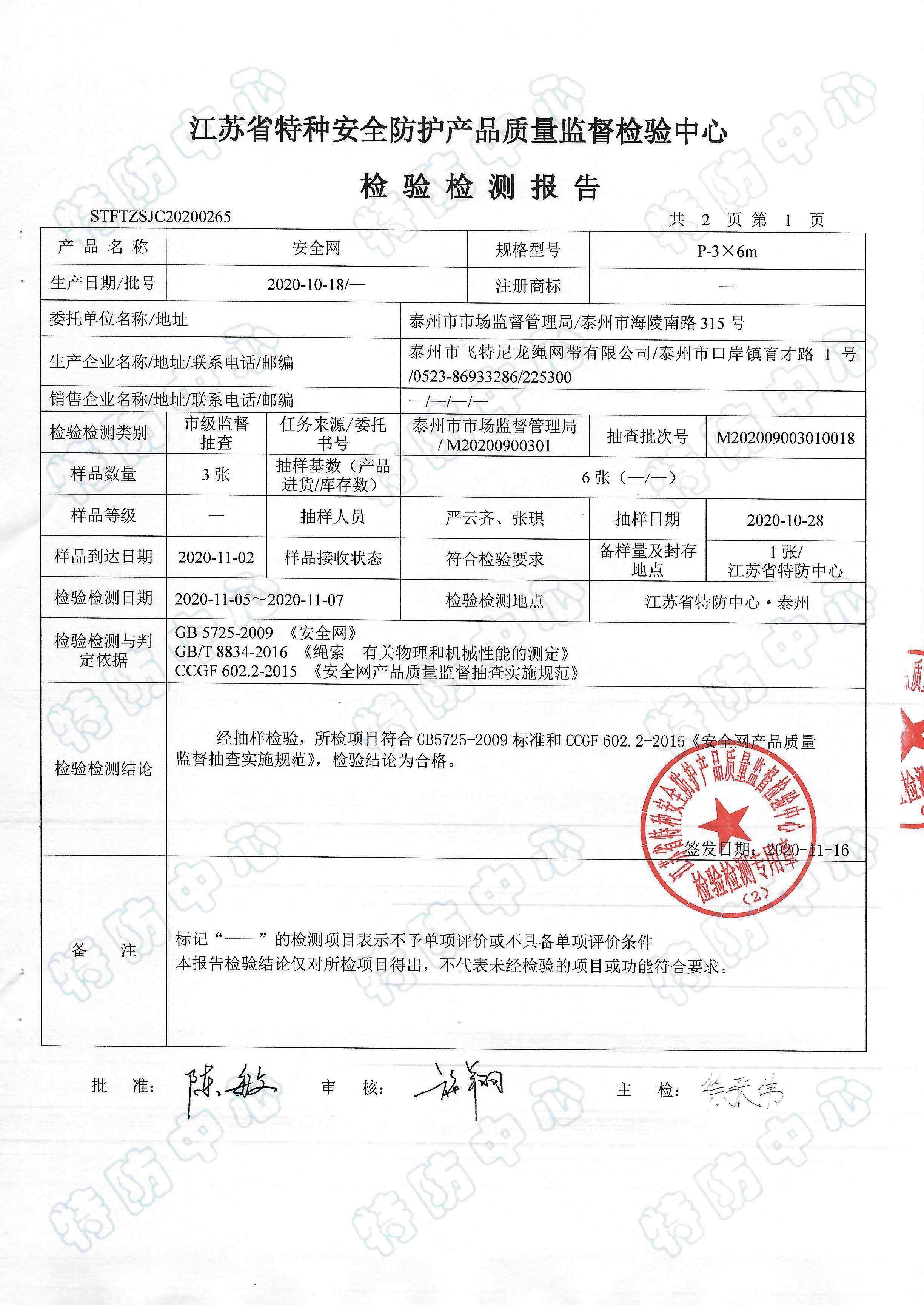 2020年9月份,江蘇省特防檢驗(yàn)中心受市場(chǎng)監(jiān)督管理局委托對(duì)我公司生產(chǎn)的安全網(wǎng)進(jìn)行產(chǎn)品質(zhì)量定期監(jiān)督抽查,檢驗(yàn)結(jié)果為合格。