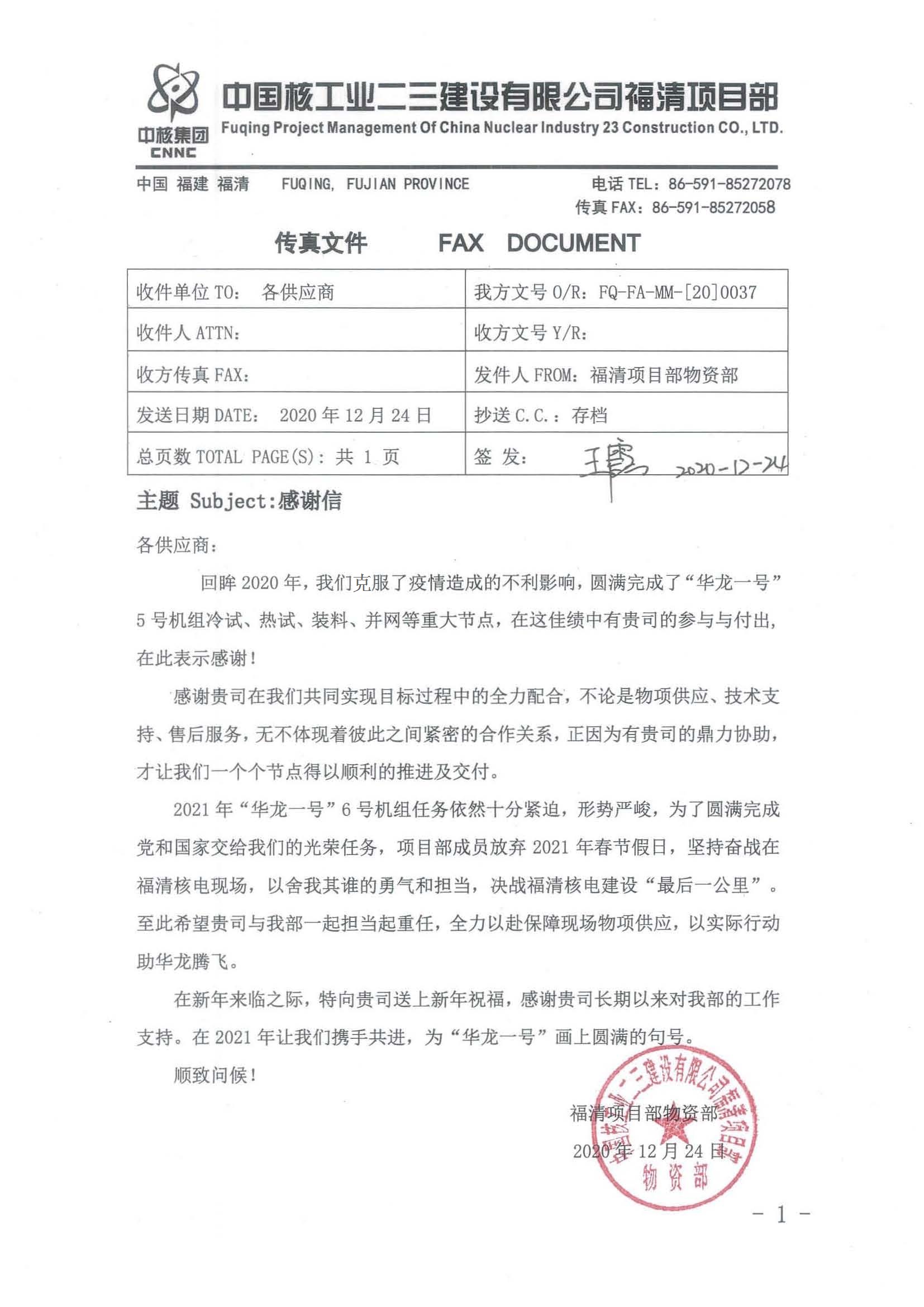 來自中核二三公司福清項(xiàng)目部的感謝信