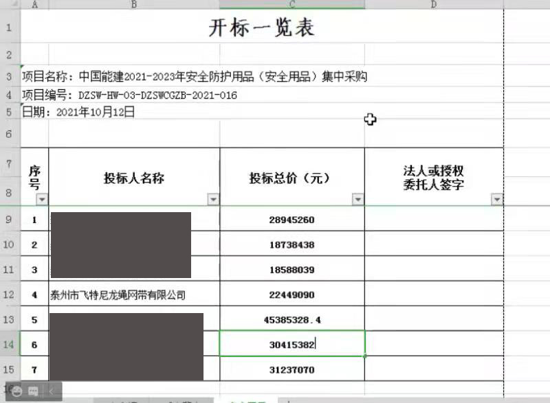 2021年10月,我司參與中國(guó)能建2021-2023年安全防護(hù)用品集中采購(gòu)項(xiàng)目,報(bào)價(jià)排名第三,經(jīng)專家組現(xiàn)場(chǎng)審核資質(zhì)參觀生產(chǎn)后,以高價(jià)中標(biāo)。